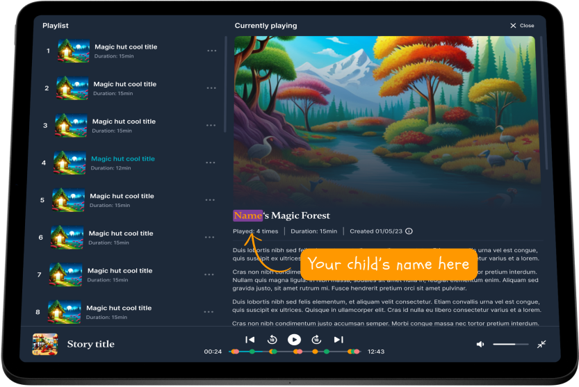 Simply answer a few questions about your child, and our AI will create a personalized story based on their interests, making it easy to enjoy together.The story will be recorded and accessible within 30 to 60 seconds, accompanied by unique bedtime story artwork representing your child's universe.